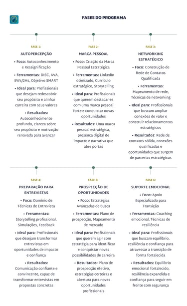 Cada fase traz ferramentas testadas — como DISC, storytelling, LinkedIn estratégico e coaching emocional que ajudam o participante a construir um plano de carreira real e sustentável.